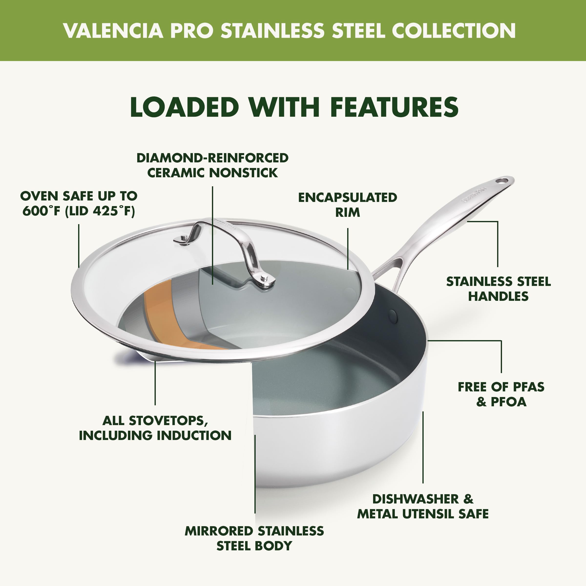GreenPan Valencia Pro Tri-Ply Stainless Steel 5QT Sauté Pan with Lid, PFAS-Free Ceramic Nonstick Coating, Induction Ready Cookware, All Cooktops, Deep Jumbo Cooker, Dishwasher & Oven Safe to 600F